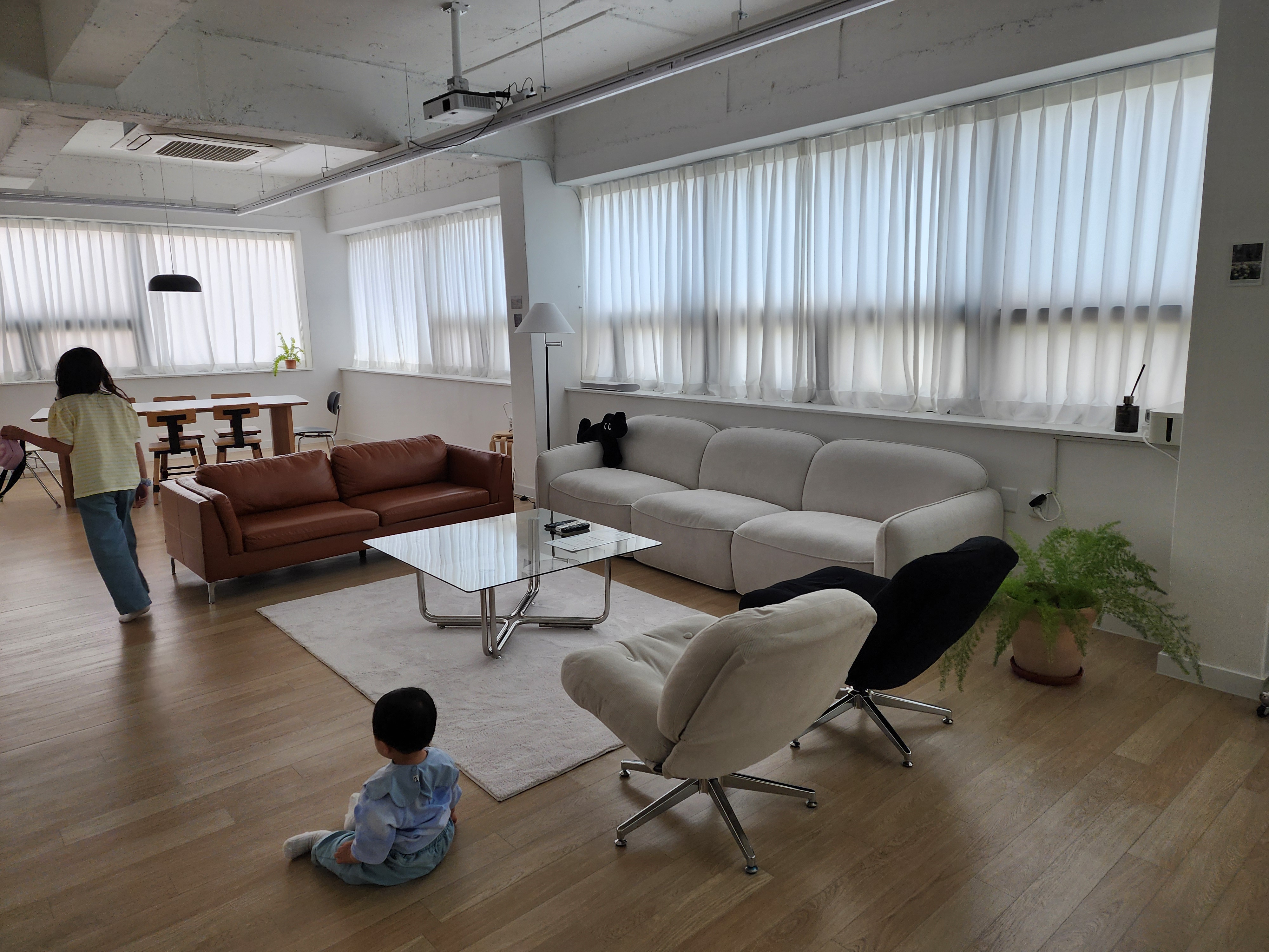 이번에 저희는 아이들과 함께 갔는데, 걱정과 달리 아가들도 정말 잘 놀더라고요. 거실 공간이 넓고 위험한 구조물이 없어서 아기들이 자유롭게 뛰어놀 수 있었어요. 부모님들도 마음 편하게 모임을 즐기실 수 있을 거예요 😊