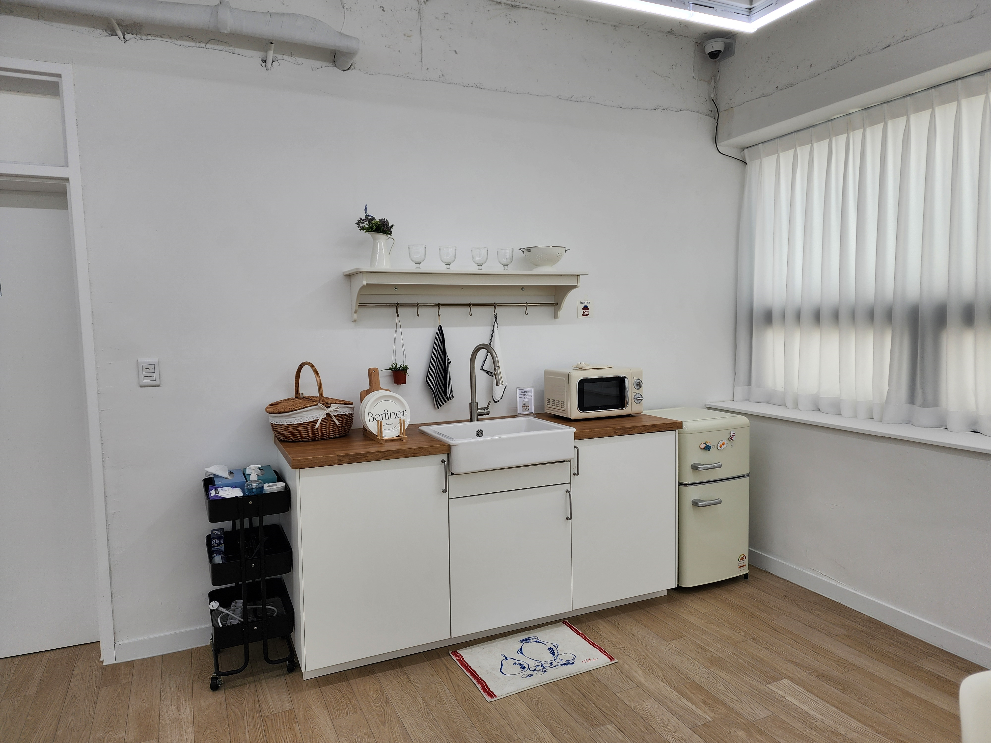 주방: 간단한 음식 준비 가능해요. 배민/쿠팡이츠 다 돼요~ 배달음식도 세팅하기 편했고요.